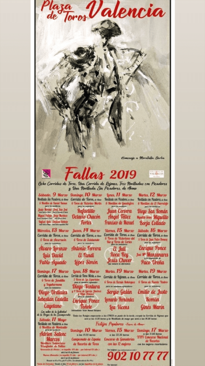 Antes de Castellón, se celebrarán este año Las Fallas, y aquí, por fin encontramos una feria con un mínimo de interés. Se dará una corrida más tras hacer el 2×1. Cuvillo pedía una suma demasiado elevada de dinero por sus toros y no estarán en Fallas, pero con ese dinero, Simón trae una de García Jiménez y otra de Zalduendo, las mismas que en Castellón. Deben estar baratas sus corridas.