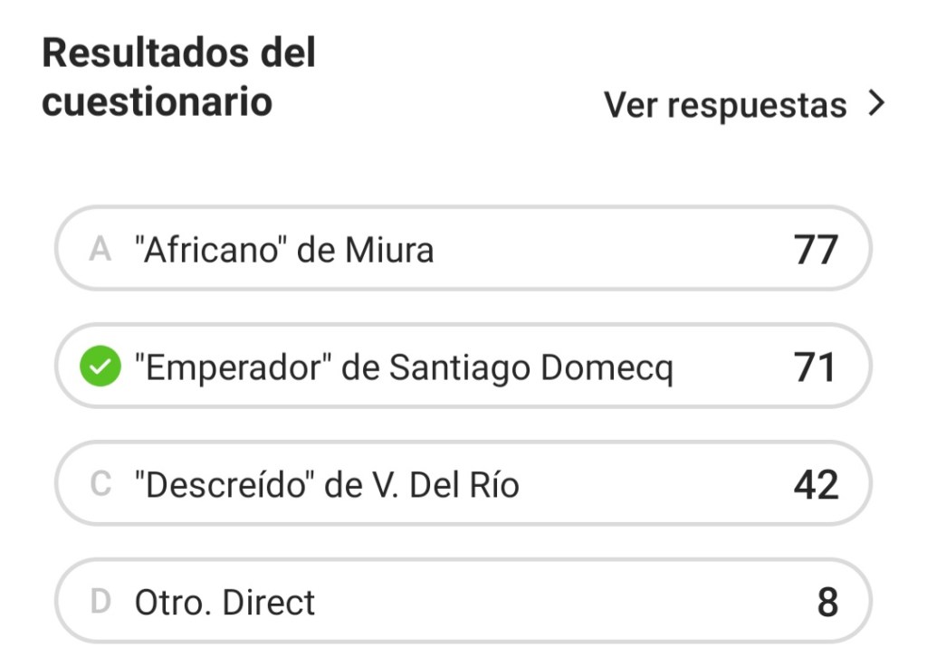 A todos los encuestados se les ha pedido que solo elijan un torero/faena/toro, no valiendo los votos ex aequo: hay que mojarse. Sin embargo, se da un empate en la sección de “mejor toro” en Twitter. Aquí no queda otra que otorgar un voto a cada uno de los dos.