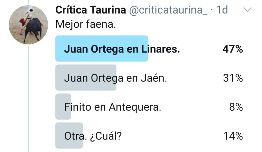 *Que la mejor la ha realizado Juan Ortega queda claro, pero no se premia a un torero en general, sino a una faena en concreto. Por lo tanto, como se explicaba previamente en las bases, el voto de la afición sirve para desempatar. Habría que sumar los votos del “tuitendido” y de la “instagrada” para saber el resultado final, aunque en este caso no es necesario, porque en ambas redes la faena ganadora ha sido la de Linares.