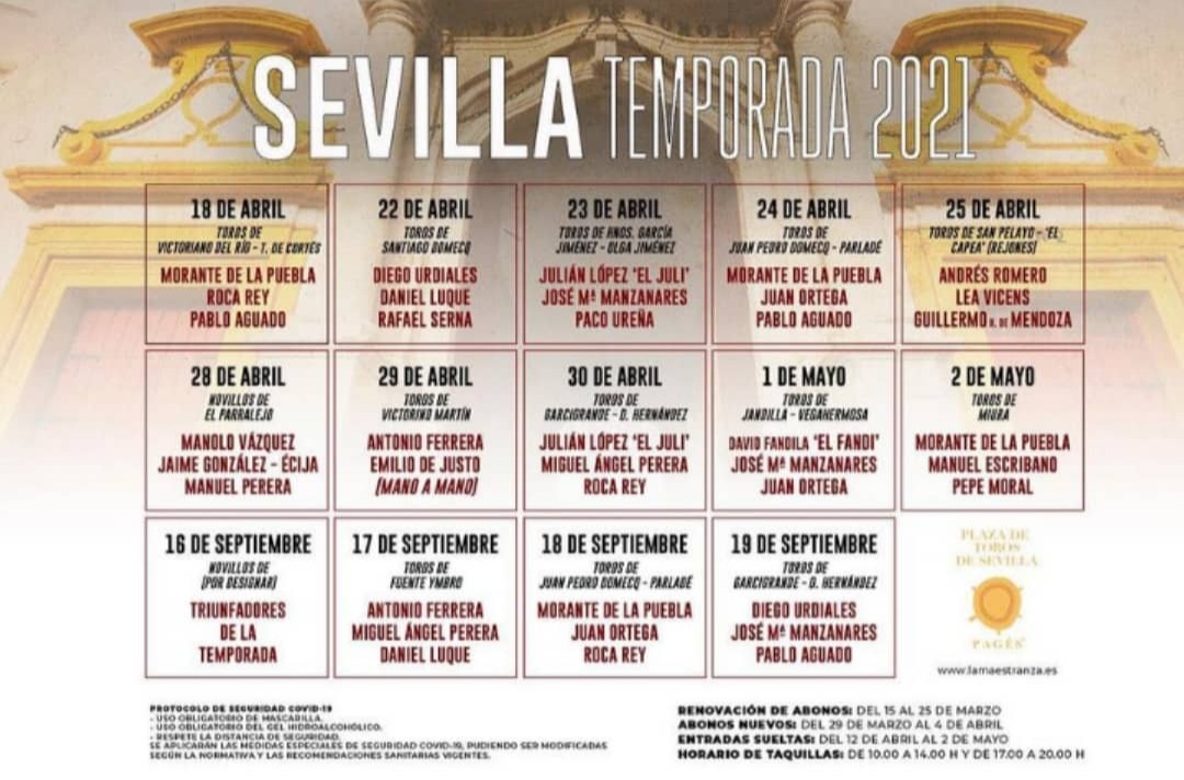 Sorprendentemente, los carteles no distan mucho de los de otros años. Esto tiene dos lecturas: la mala es la habitual monotonía que caracteriza a los carteles de Sevilla, repetitivos año tras año y pensados para ir uno o dos días a los toros, pero no para abonarte, ya que no tiene sentido ver todos los días «lo mismo». Tampoco ayudan para nada los precios de la plaza más elitista de España, sin lugar a duda. Solo así se explica que Ramón Valencia haya podido contratar a casi todas las figuras (luego iremos con las ausencias más destacadas) y varias tardes: tres o cuatro tardes algunos. En mi opinión, como decía, es demasiado repetitivo, pero tiene mérito juntar tanto torero de postín en una época de aforos reducidos. Esa sería la parte buena: vuelven las figuras (que en Sevilla tienen la experiencia de que son necesarias) y los jóvenes también tiran del carro. Entre ellos destacan tres nombres propios: Andrés Roca Rey, que volvería a los ruedos españoles, Pablo Aguado, tras su histórica tarde en el abono de 2019 y Juan Ortega, la nueva esperanza sevillana, al que le han dado tres tardes que le pueden dar o quitar mucho. Demasiado arriesgada la apuesta. Con dos tardes habría tenido suficiente, ya que aún no ha tenido un éxito rotundo como sí lo tuvo Pablo Aguado. Hablando de estos dos artistas sevillanos, será un placer verlos en el mismo cartel junto a Morante… ¿o tal vez no? Que los toros sean de Juan Pedro Domecq le resta muchísimo interés al cartel, ya que es una ganadería con un altísimo porcentaje de petardos. Los toreros la quieren porque son toros que no molestan, aunque si alguien puede lucir con ellos son los toreros artistas. No obstante, si ya es sonrojante que Juan Pedro vuelva tras dar al traste con uno de los mejores carteles de la Feria de abril de 2019 (y tantos otros años atrás), que encima haga doblete es inexplicable (tengamos en cuenta que ganaderías como La Quinta no tienen una oportunidad). Y para colmo casi se repite la terna: Morante, Aguado y Ortega en Feria y Morante, Ortega y Roca Rey en San Miguel. Lo dicho: monotonía.