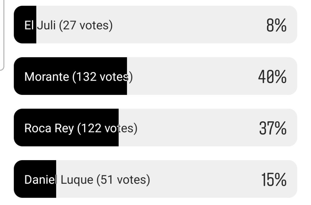 Por lo tanto, el TRIUNFADOR del año es MORANTE. Se alza con el premio con 12 votos, superando así los 10 votos de Roca Rey. Completa el pódium Ángel Téllez con 3.