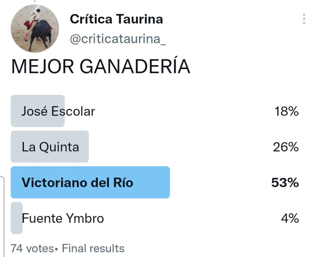 Después de varias entradas echando la vista atrás para decidir qué ha sido lo mejor de la temporada, hoy terminamos estos premios votando a la GANADERÍA TRIUNFADORA, galardón con el que se alzó por amplia mayoría Victoriano del Río el año pasado (https://criticataurina.com/2021/11/02/premios-taurinos-de-2021/). ¿Repetirá de nuevo?
