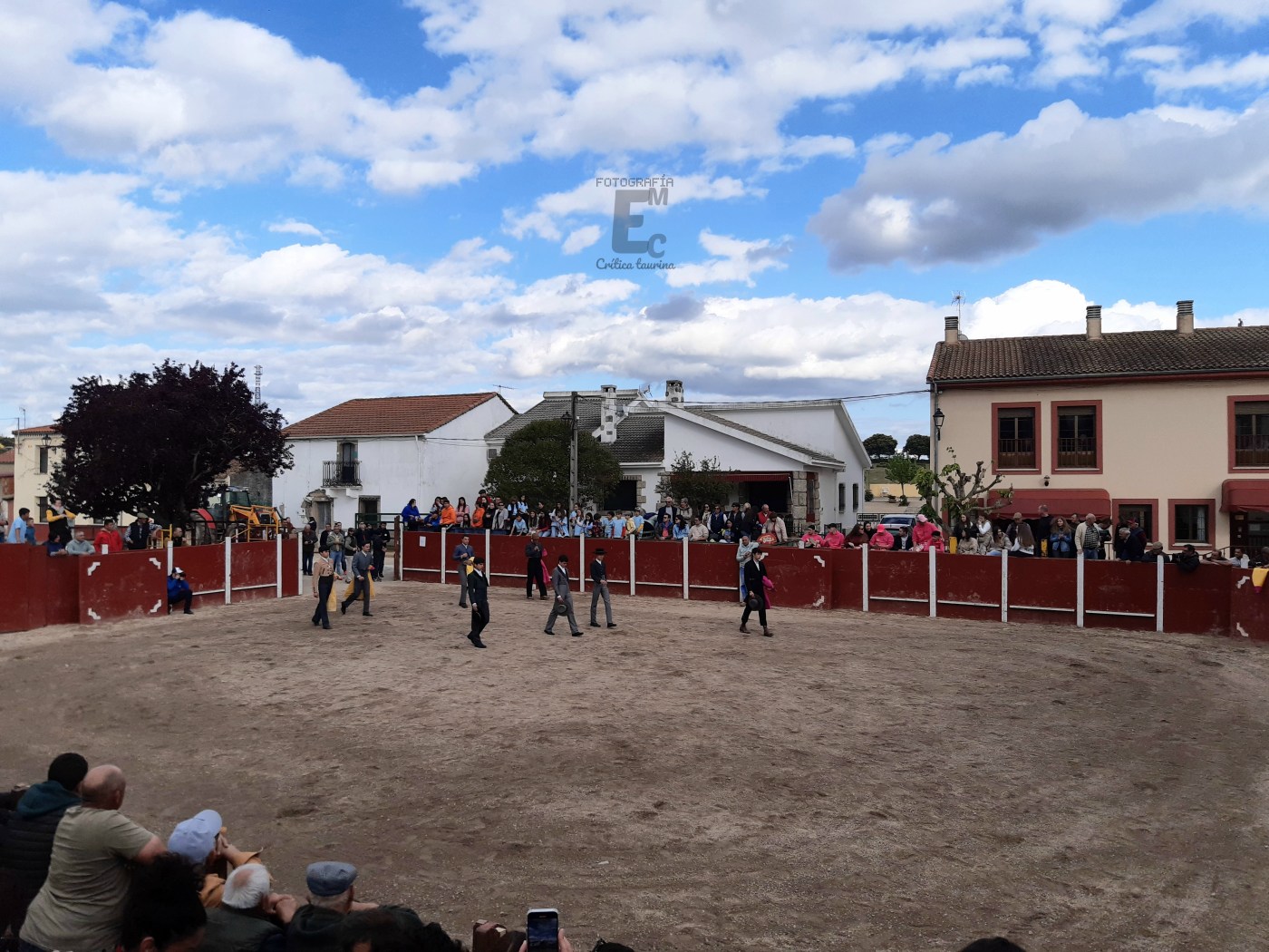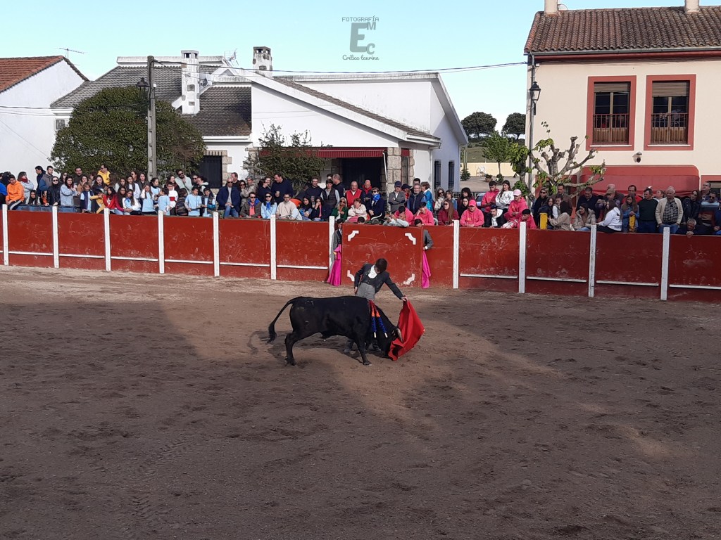 En Olmedo de Camaces (Salamanca) se celebró una clase práctica por las fiestas de San Jorge. A pesar de que la tarde era fría, Julio Méndez la calentó en el segundo del festejo. Entró al turno de quites Jesús Iglesias volando el capote con temple y suavidad por tafalleras y Julio no quiso dejarse ganar la pelea y realizó faroles. El eral de Andrés Celestino García estuvo justo de fuerzas, pero tuvo recorrido, nobleza y mucha clase. Méndez realizó una variada faena en la que mostró todo su repertorio. Empezó por cambiados por la espalda, hizo circulares, bernadinas… Precisamente, al cambiarle el viaje al novillo en una bernadina fue cogido sin consecuencias. Previamente había toreado con elegancia tanto con la derecha como al natural, todo muy ligado y bien rematado con los pases de pecho. Tragó mucho al animal, atornillado siempre en la arena y cortó las dos orejas, mientras que al «Dionisio» de Andrés Celestino García se le premió con la vuelta al ruedo en el arrastre.