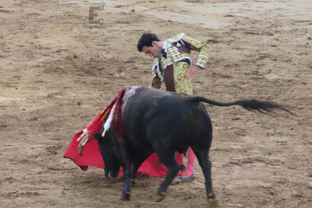Después de las series de derechazos y naturales, ligadas pero sin rematar detrás de la cadera, llegó el arrimón final, incluyendo circulares. Puso al público en pie, pero pinchó en dos ocasiones, antes de dejar un bajonazo.