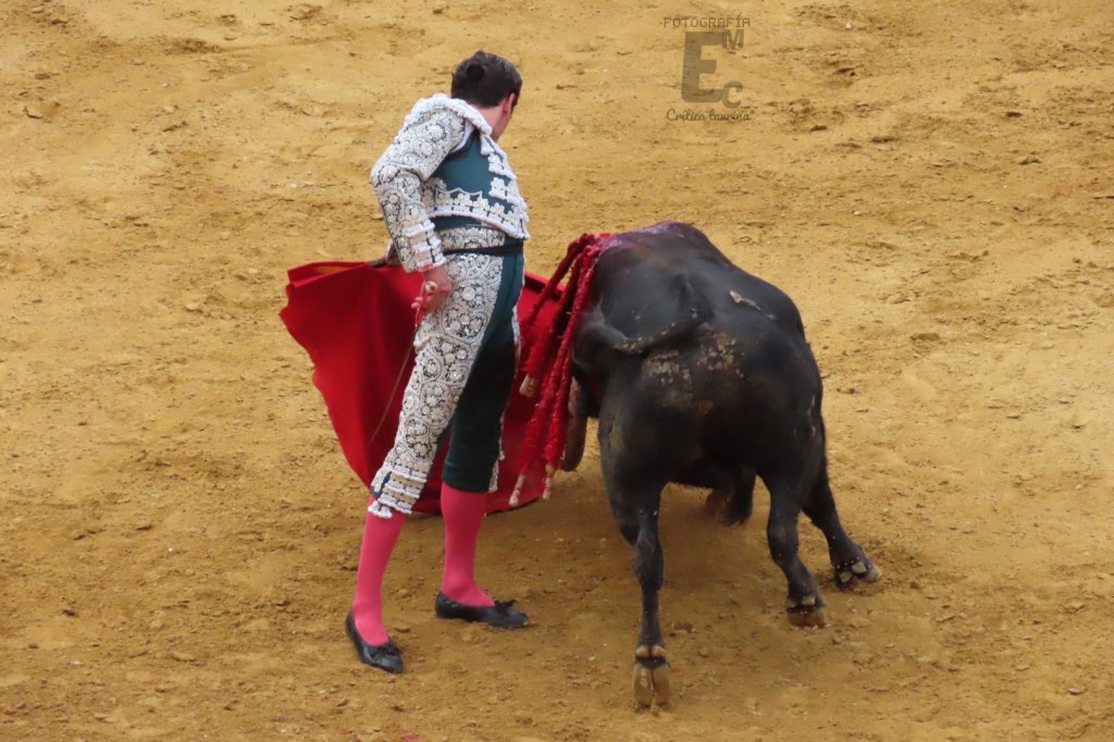 Pablo Aguado tuvo la difícil tarea de actuar detrás de su paisano, y es que después de ver a Juan Ortega parecía que ya nada importaba. Todo estaba ya visto. En especial, esa sensación se tuvo (o, al menos, yo la tuve) en el sexto. El cuvillo era muy montado, pero por su justeza de fuerzas fue devuelto a corrales, lo que le costó un disgusto a Pablo Aguado, como exteriorizó con sus gestos. El torero no quería que se devolviese (había pedido el cambio de tercio), sabiendo que el sobrero de Loreto Charro era muchísimo más serio que la «novillada» que había traído Cuvillo. Y salió el sobrero, con sus dos imponentes velas. Un toro con mucho trapío, aunque pocas hechuras de embestir. Remató en las tablas y se pegó un golpetazo del que pudo quedar mermado, ya que había ocasiones en las que mostraba una ligera descoordinación. Aguado se justificó.