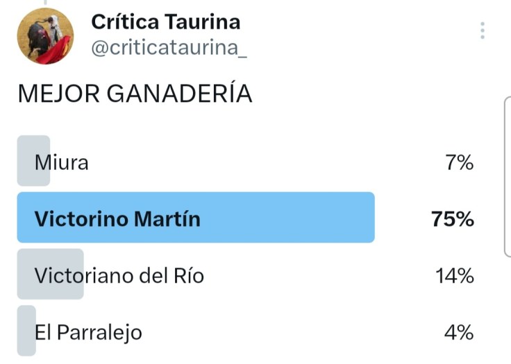 Con treinta votos, VICTORINO MARTÍN se convierte en la mejor ganadería de 2023. Tan solo cuatro votos no han ido a parar a la ganadería de la A coronada. Estos cuatro votos han estado repartidos en cuatro ganaderías diferentes: Santiago Domecq, El Parralejo, Miura y Victoriano del Río.