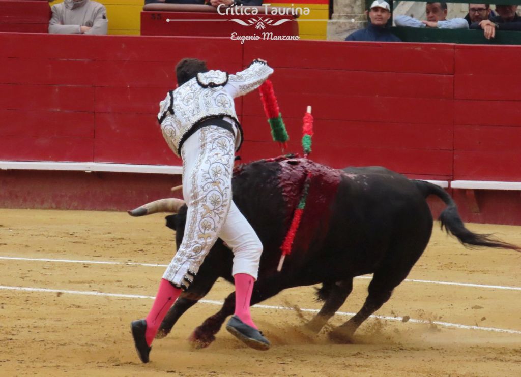 El cuarto era para cortarle las dos, pero volvió a cortarle solo una, que, eso sí, le abría la Puerta Grande de la ciudad del Turia. Lo recibió con una larga cambiada de rodillas y destacó con los garapullos, especialmente, en el último par al violín hacia los adentros, que cayó en todo lo alto. Puso al público en pie tras juguetear con el toro. Empezó la faena de rodillas por alto antes de dejar una serie de derechazos muy vertical, hasta impropia de él. Después la faena ya no tuvo naturalidad ni ajuste, sobre todo cuando tomó la izquierda, a pesar de que el toro hacía el avión y tenía un gran recorrido. Sin embargo, estuvo muy inteligente cuando el toro se quiso rajar, dejándole la muleta siempre puesta en la cara y recurriendo a los circulares y molinetes.