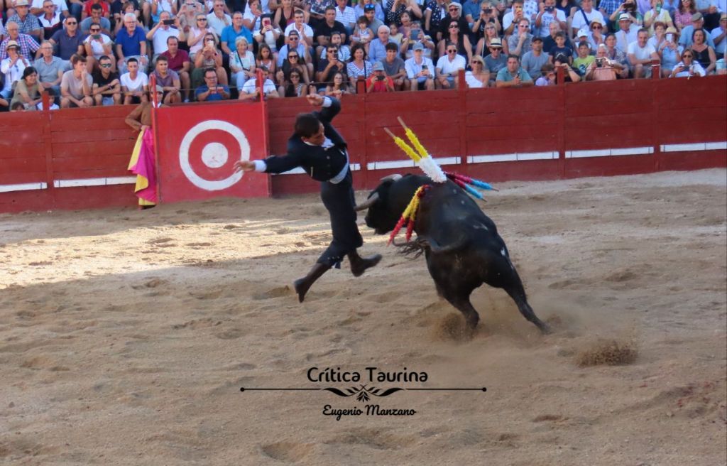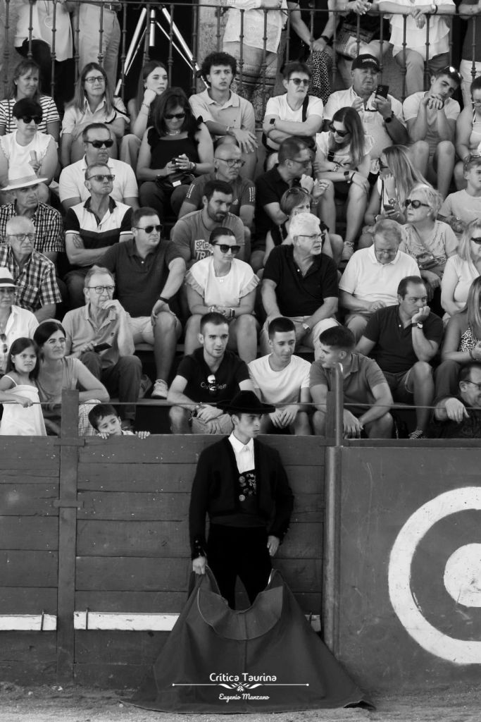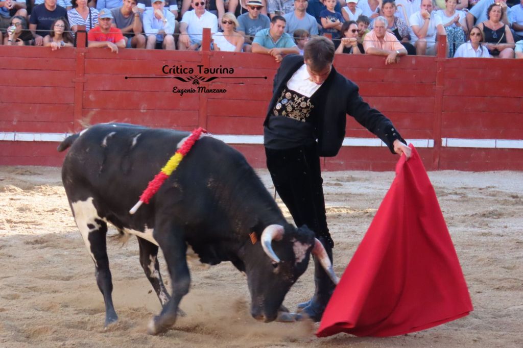 El novillo se desplomaba constantemente. Tal vez habría que haberlo visto en otros terrenos con menos arena. Seguramente, se habría ido al suelo o, quizás, no. Nunca lo sabremos porque Esaú hizo la faena en un palmo de terreno. Cuando bajó la mano como a él le gusta el toro no aguantó más de una serie, por lo que recurrió al toreo de cercanías, en el que también se siente cómodo, con el arrimón y circulares invertidos. No es de mi gusto este toreo, pero en los pueblos gusta y, por ello, cortó las dos orejas.