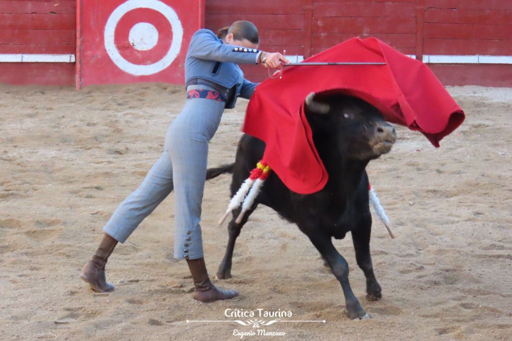 Raquel Martín toreó con empaque a la verónica y mostró un concepto del toreo largo, enganchando muy delante y soltando atrás, aunque sin la suficiente técnica para que surja fluido. No obstante, sus maneras son buenas. Donde más se vio que está verde fue a la hora de entrar a matar. Le costó un mundo cuadrar al novillo y, tras un pinchazo sin terminar de hacer la cruz, se tiró con todo en el siguiente intento sin importarle salir volteada. Con más valor que técnica. Puso al tendido en pie. Cortó una oreja.