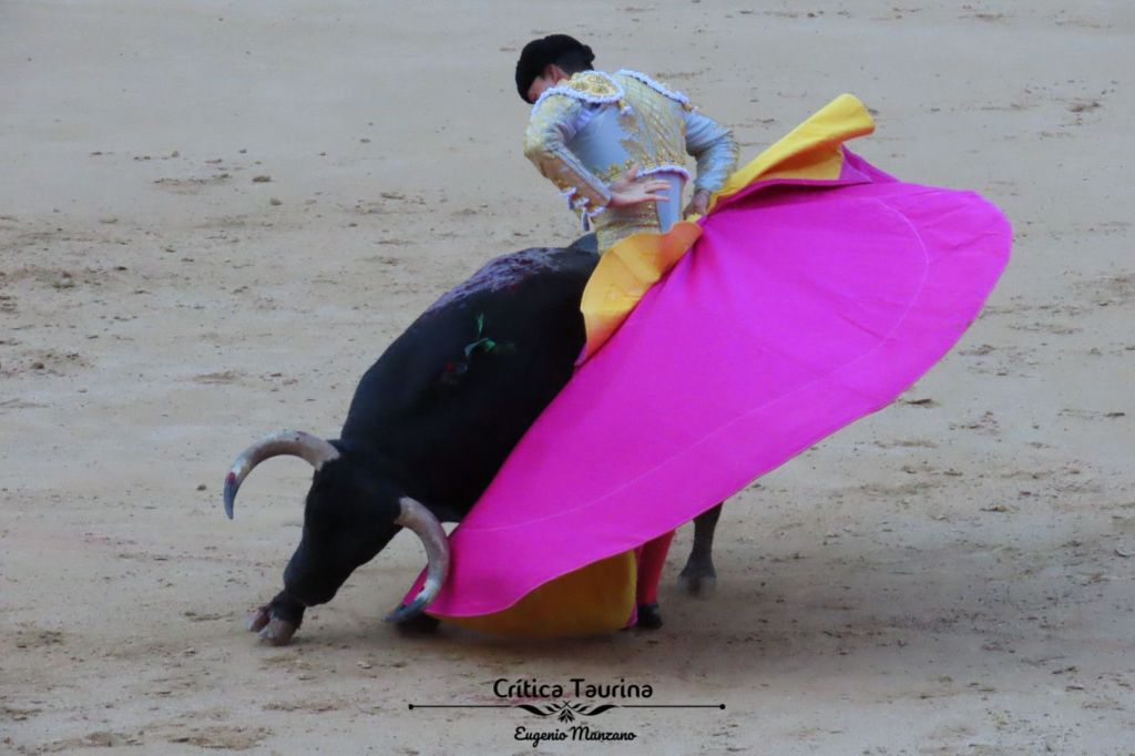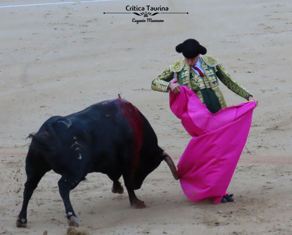 Tras ese gran tercio de banderillas se creó un silencio de expectación que solo se puede dar en Madrid al no haber música, pero rápidamente se vio que la faena no iba a tomar vuelo. Ya en la serie inicial de rodillas el novillo desarmó a Chicharro. No hubo más desarmes, pero sí enganchones prácticamente en cada pase por el tornillazo que soltaba el novillo después del embroque. Mató de una estocada al primer intento tendida, trasera y atravesada, aunque no fue poco que matase a la primera tras el discurrir de la tarde. Especialmente, en los primeros novillos pincharon reiteradamente los novilleros.