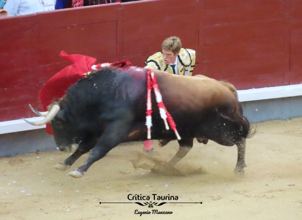 Comenzó el trasteo de rodillas haciendo el péndulo y el toro le puso en pie con un derrote a altura de la axila. Le vino a decir que necesitaba que le pudiesen, mas desbordó a Adrián. Apenas le dejaba ni colocarse, porque se arrancaba. Qué prontitud. Cómo transmitió este toro el peligro que tuvo. Otra cogida para el torero, esta más aparatosa, pero sin consecuencias. Fernando, muy valiente, decidió seguir tirando la moneda al aire y cerró por bernadinas, aunque no consiguió tragar con más de dos y terminó huyendo. Fue un toro difícil, pero al que con más poderío le podría haber cortado la oreja. La plaza se dividió. ¿Le tendría que haber dado un tercer puyazo para atemperarlo más?