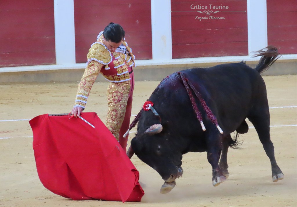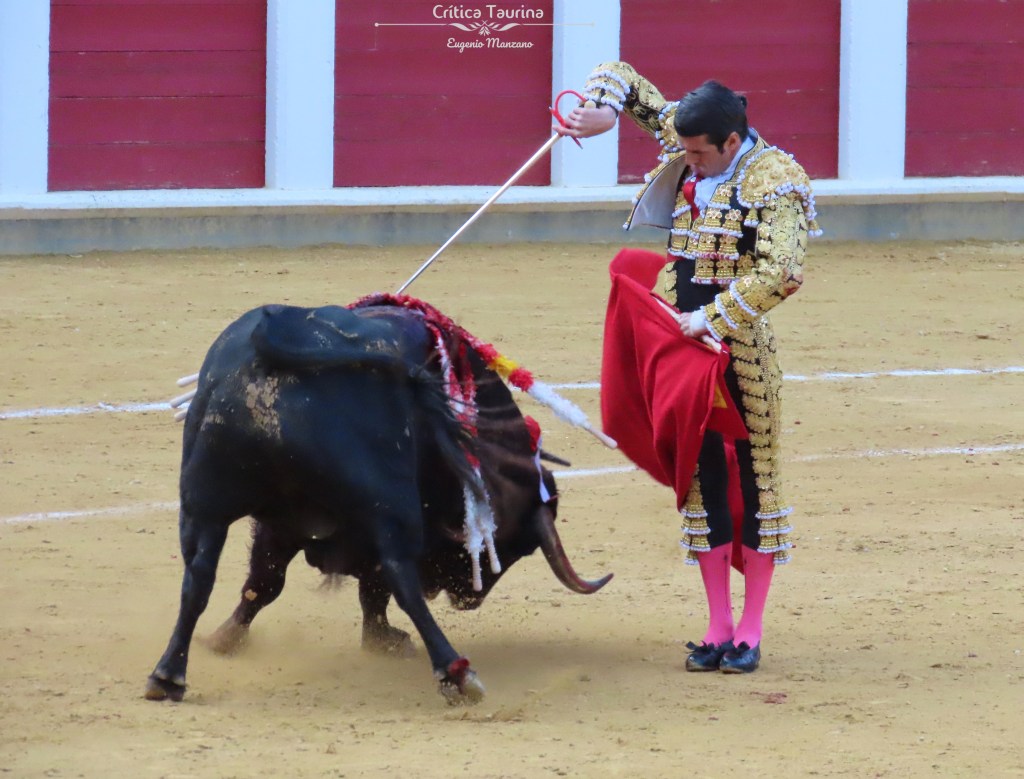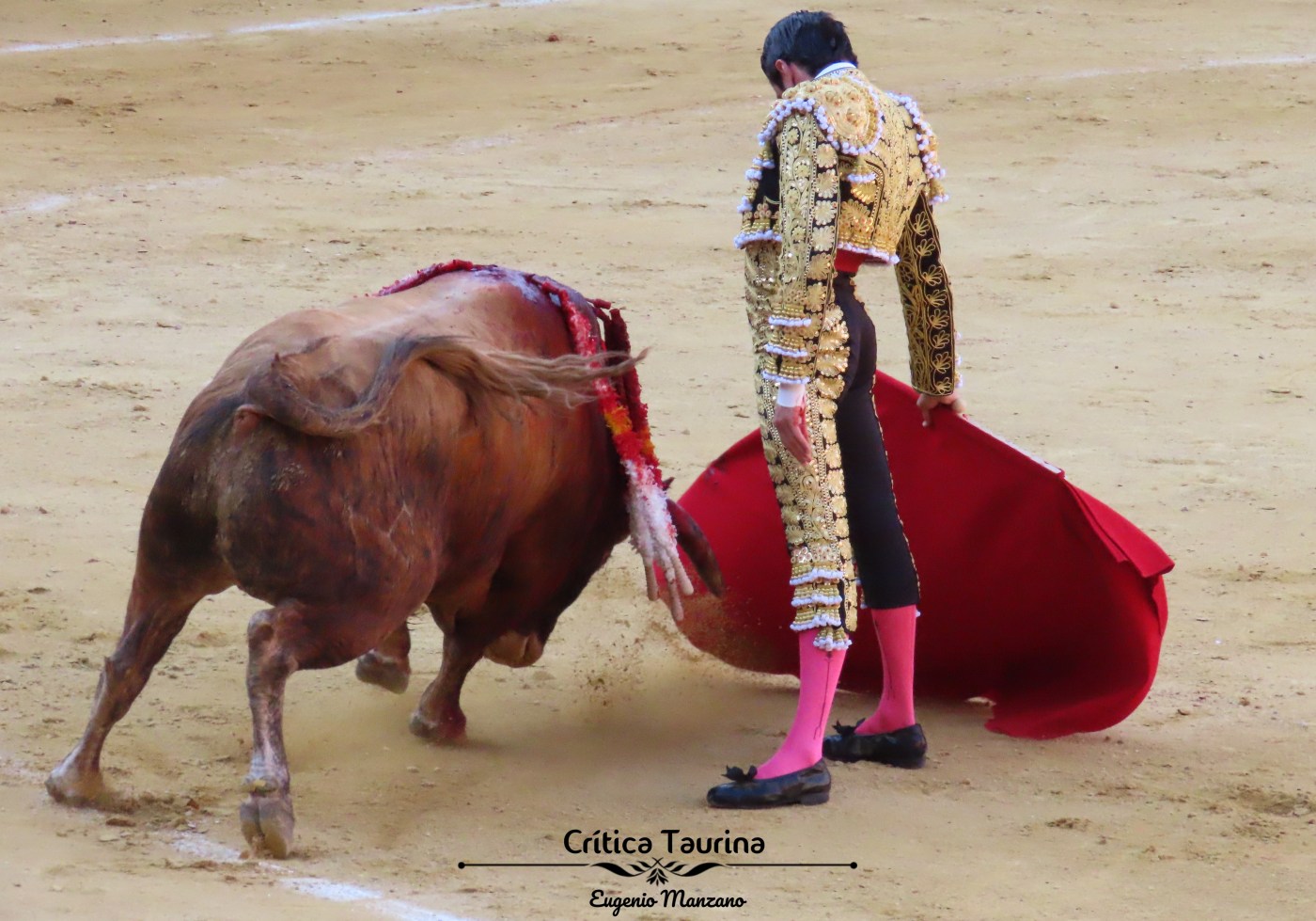 Morante tuvo que esperar un largo tiempo hasta que saliese el primero, seguramente, esperando a que entrase toda la gente, ya que esta plaza tiene muy malos accesos. Lo saludó con varias verónicas con empaque, pero enganchadas. Con la muleta dejó un natural al ralentí y otro enfrontilado a pies juntos de nota. Tampoco faltó su inspirado molinete, pero la faena nunca rompió por la poquita fuerza y la sosería del cuvillo.