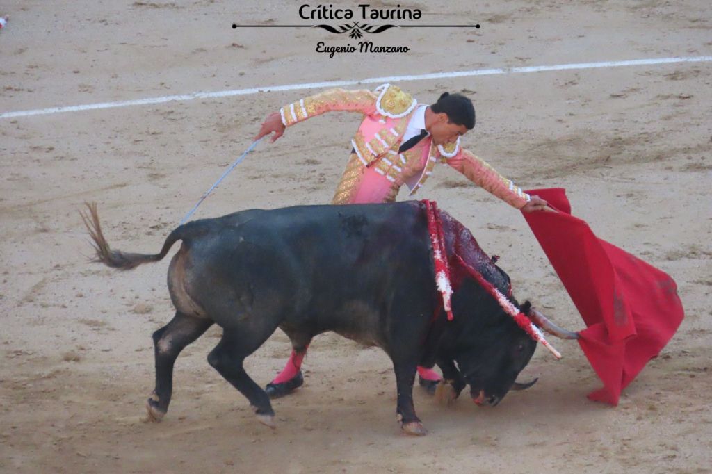 Tras cumplir en el caballo, Borja Jiménez realizó un inicio de faena sensacional, con un último natural en redondo que puso el listón muy alto. La virtud del de Espartinas fue mantener ese tono altísimo, siguiendo toreando al natural, aunque las dos siguientes tandas no tuvieron la misma rotundidad al no lograr reducir la embestida tanto como lo hizo en ese natural eterno. Estuvo algo más amontonado. Probó la derecha y se vio que el pitón, claramente, era el izquierdo. Hizo bien Borja Jiménez en mostrárnoslo y se dio cuenta antes que nadie de que era un toro para apostar al natural, empezando su faena y basándola en la mano izquierda. Cuando volvió a ponerse al natural tras ese breve intento con la diestra la faena volvió a su cauce. Más en línea de lo que acostumbra. La última serie fue cumbre, con otro nuevo último natural en redondo en el que se detuvo el tiempo ligado con un molinete y el de pecho. A Borja le sale todo. El toro fue de triunfo claro.