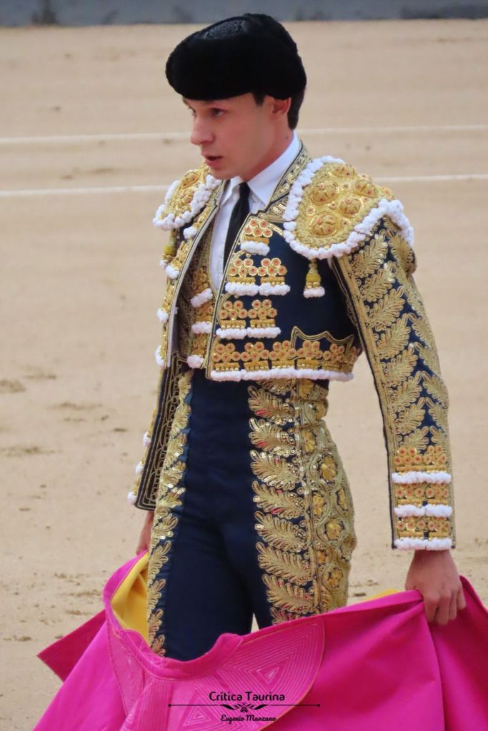 Sí le ligó varios naturales de nota al último (al que también recibió a portagayola), en dos series muy compactas tirando de la embestida con temple, aunque con el defecto de rematarlas con un pase de pecho muy antiestético, sacando muchísimo el brazo para pasárselo lejos y retorciéndose. Quiso seguir al natural y se pasó de faena, pues el novillo ya no embestía.