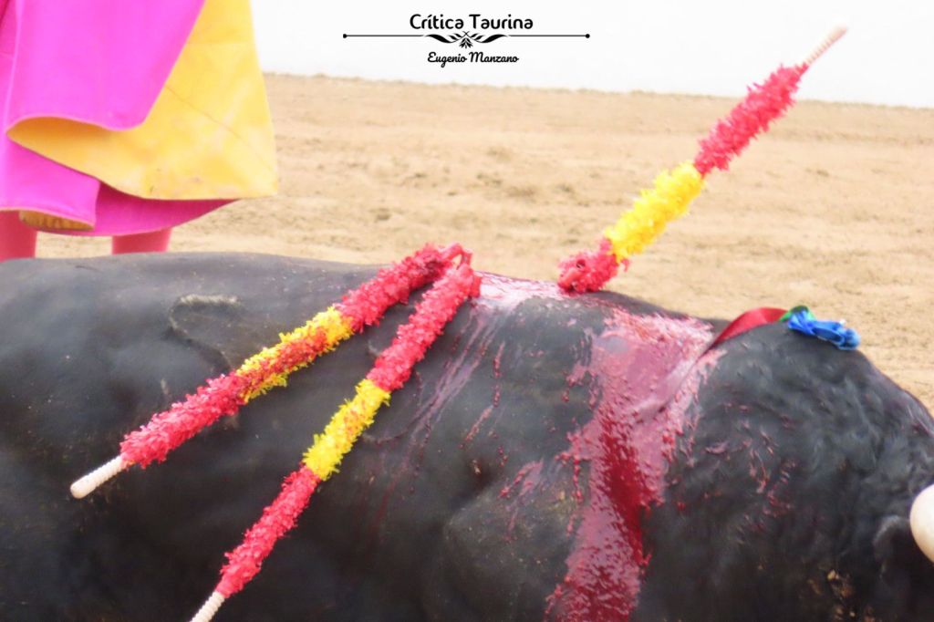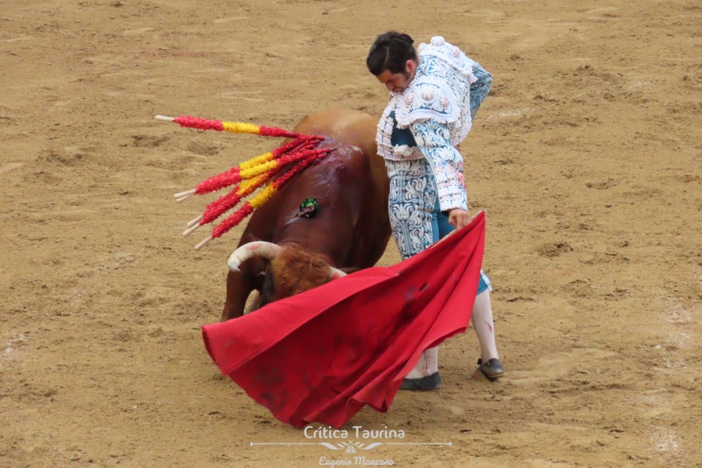La faena tuvo aroma, aunque fue de más a menos, pues bajó mucho por el pitón izquierdo. Claramente, el pitón bueno fue el derecho. Todo lo que hizo Juan Ortega tuvo mucha torería, aunque en la segunda mitad de esta hubo menos acople. Aún así, el trianero estuvo muy inspirado, dejando detalles como un molinete, otro invertido, el pase de las flores y un pase por alto con el envés de la muleta, sin ser de pecho. Pinchó y perdió una oreja de peso.