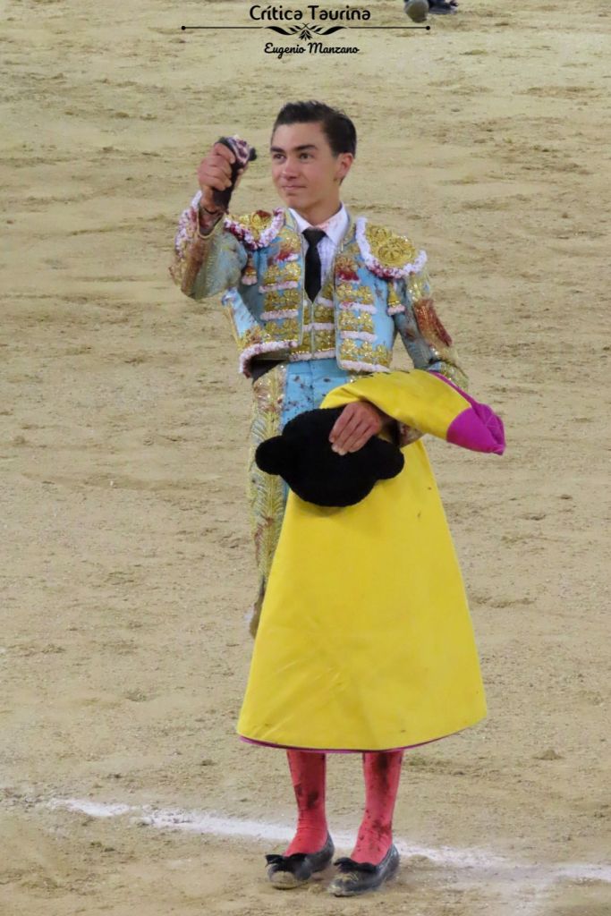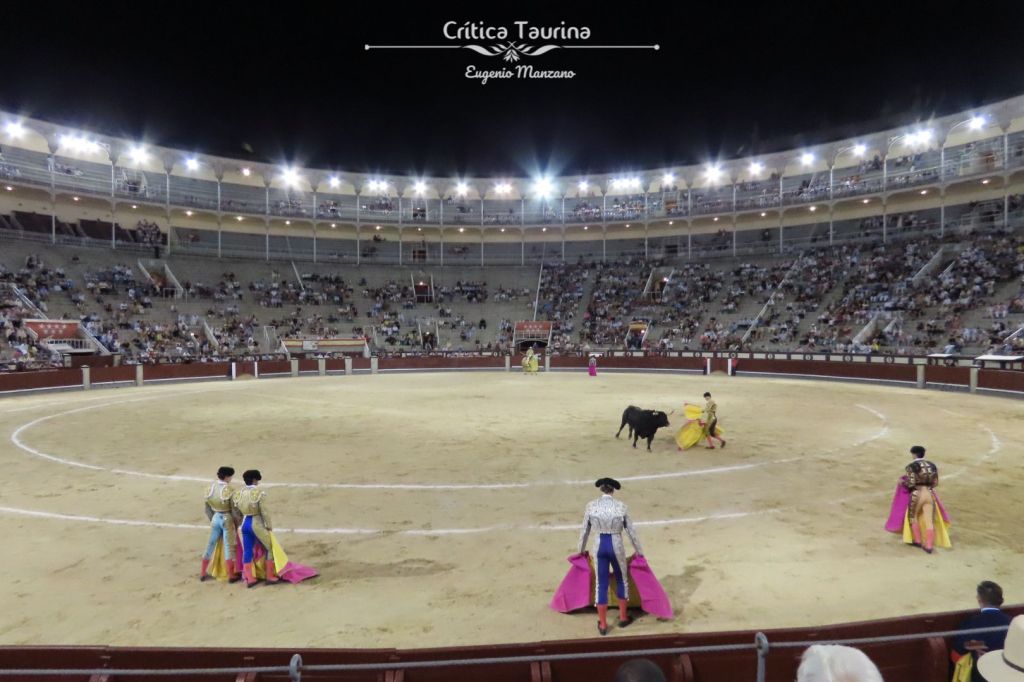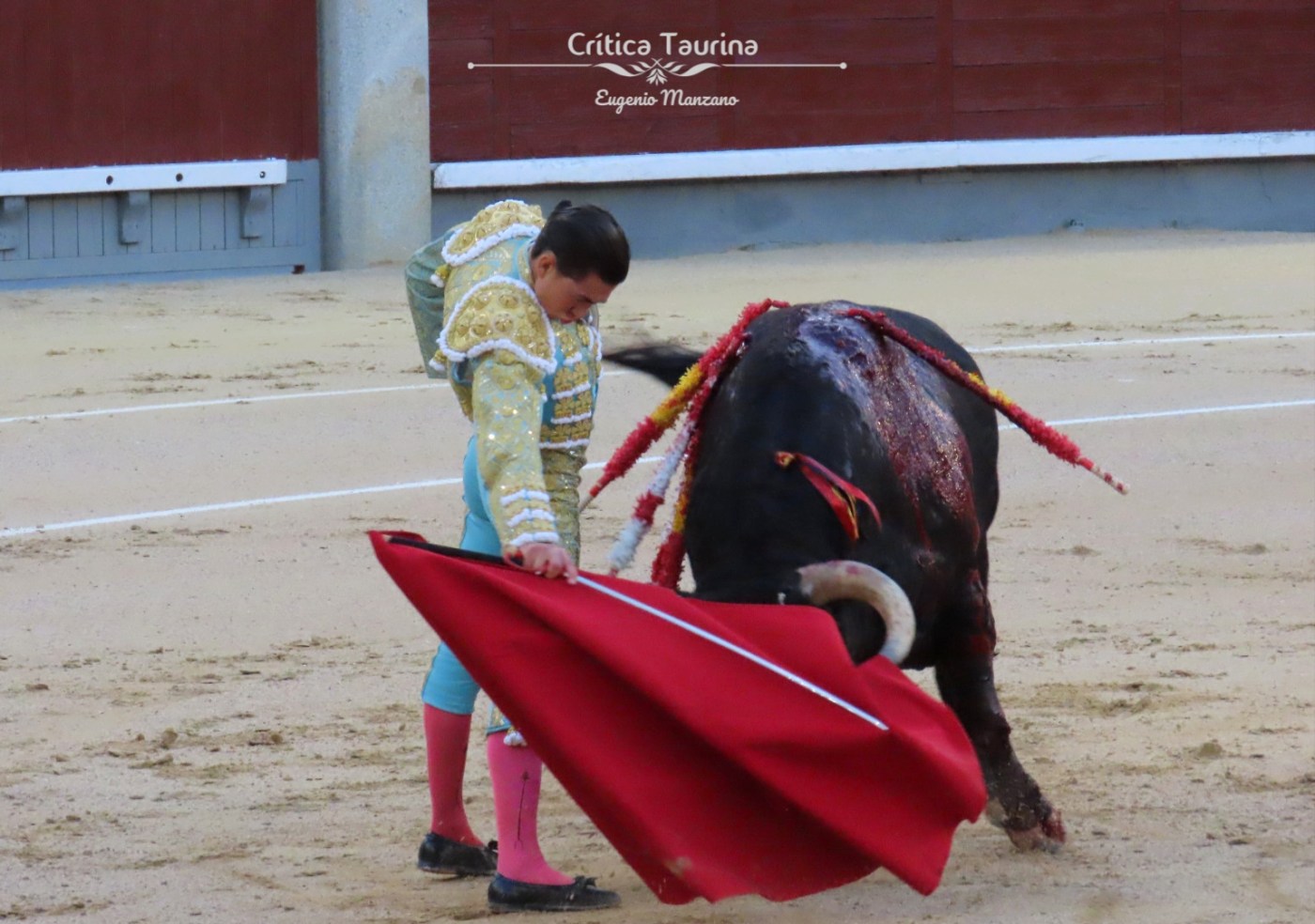 Aunque el toro tardó en caer, cortó una oreja con algunas protestas. En mi opinión, la oreja fue justa, aunque es innecesario el teatro que se monta con el presidente tardando tanto en sacar el pañuelo si finalmente lo va a sacar y con las mulillas esperando en lugar de ir a recoger al novillo. Por eso, se escucharon gritos de «mulilleros peseteros».