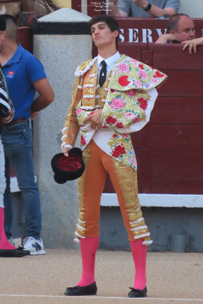 Abrió plaza un novillo muy bonito de Los Maños. Muy en el tipo del encaste Santa Coloma – Buendía (toda la novillada estuvo muy entipada). Tenía clase, pero no estaba sobrado de fuerza, y manseó ligeramente. Por ejemplo, en un arreón al salir del caballo o en el inicio de faena de El Mella con el péndulo en los medios. Tras el cambiado por la espalda el novillo salió suelto y El Mella prosiguió por estatuarios. La primera de derechazos fue buena, muy ligada, mas la faena se fue diluyendo hasta el final, cuando volvió a levantar el vuelo mediante las bernadinas. En el primer intento al realizar la suerte suprema hizo guardia. Se perfiló en el segundo en la suerte contraria sin pegar el telonazo y el novillo le lanzó un feo derrote, rompiéndole la taleguilla. Todo se quedó en un susto tras estar unos segundos prendido del pitón.