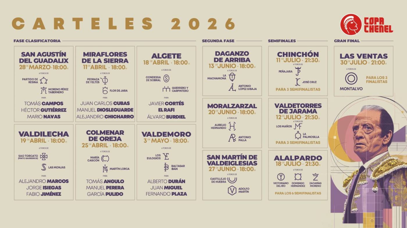 Es, sin duda, la gran cita de la primera fase. No obstante, hay otras dos tardes que también considero muy atractivas. La primera de ellas es la del 18 de abril en Algete con la presencia de dos toreros con un gran concepto del toreo, como son Javier Cortés y Álvaro Burdiel (finalista del año pasado, que resultó cogido) y El Rafi. La segunda de estas tardes es en el puente de mayo, el día 3 en Valdemoro. Tras la gran corrida que allí lidiaron el año pasado Baltasar Ibán y Los Eulogios, ambas divisas vuelven a repetir en esta localidad del sur de la Comunidad. La corrida la estoquearán Alberto Durán, Juan Miguel y Fernando Plaza. Mucho ojo con el zamorano Alberto Durán, que también sabe torear muy bien y en su primera comparecencia en la Copa Chenel tuvo el infortunio de la cogida cuando estaba dejando muy gratas sensaciones. Ahora, vuelve a tener la oportunidad.