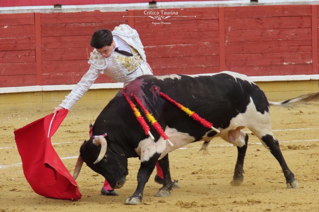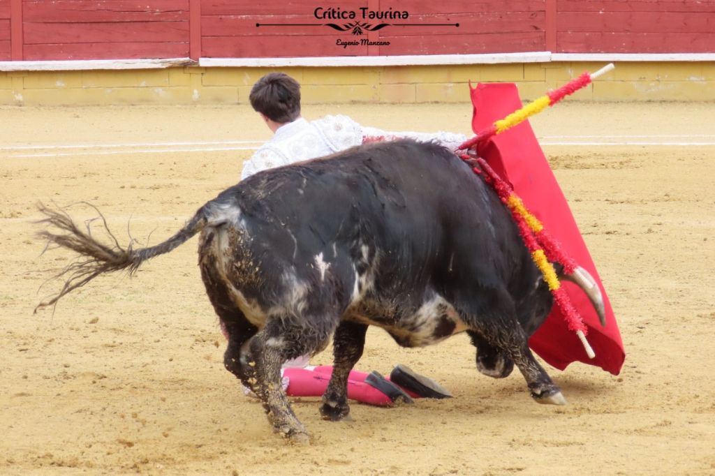Saludó al de Guerrero y Carpintero también de hinojos, en este caso toreando la verónica con cadendia y rematando con la larga cambiada. Este novillo ya mostró desde el comienzo mejor son. Se dejó pegar en su paso por el caballo. Mario es un novillero, en mi opinión, demasiado tremendista, aunque el prólogo de la faena fue muy meritorio, no solo por el péndulo de rodillas que realizó en los medios de la plaza a pesar del viento, sino porque luego prosiguió estático toreando al natural y se lo pasó muy cerca. Estuvo a punto de ser cogido.